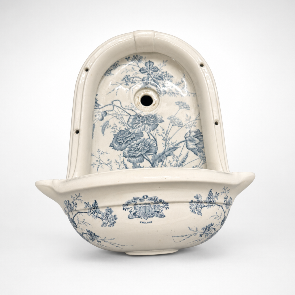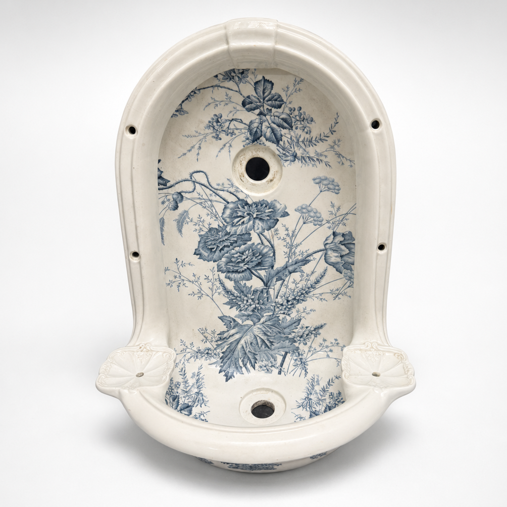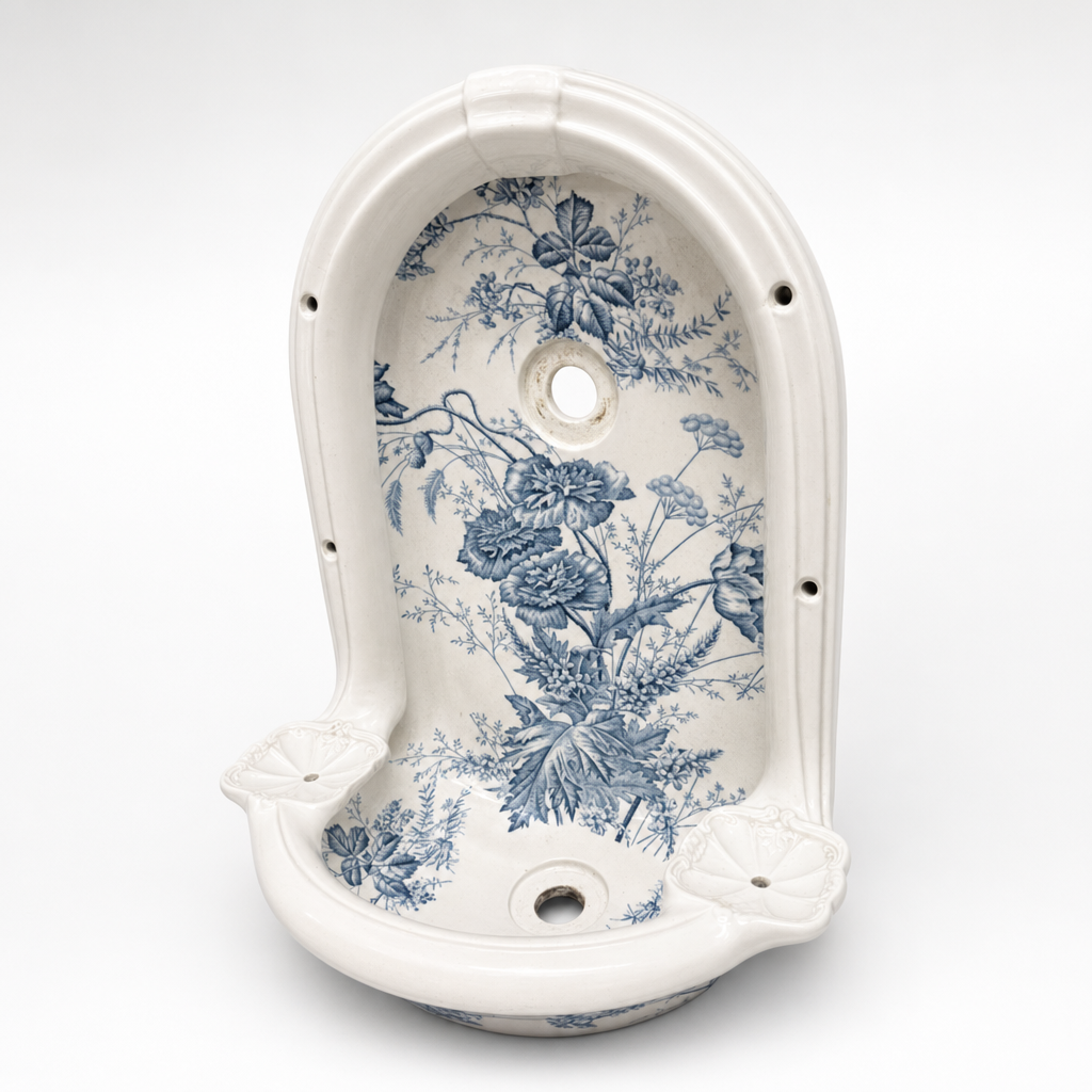 Wie denkt dat blauw-wit keramiek alleen bij Delfts aardewerk hoort, heeft dit fonteintje nog niet gezien. Een boogvormig wandfonteintje van crèmewit keramiek, 48 cm hoog, 35 cm breed en 20 cm diep, volledig bedekt met een weelderig blauw bloemmotief in de traditie van de klassieke transferdruk. Grote pioenrozen, rankende takken, fijne veldbloemen het geheel ademt de sfeer van een Engels of Frans adellijk interieur uit de late negentiende eeuw.