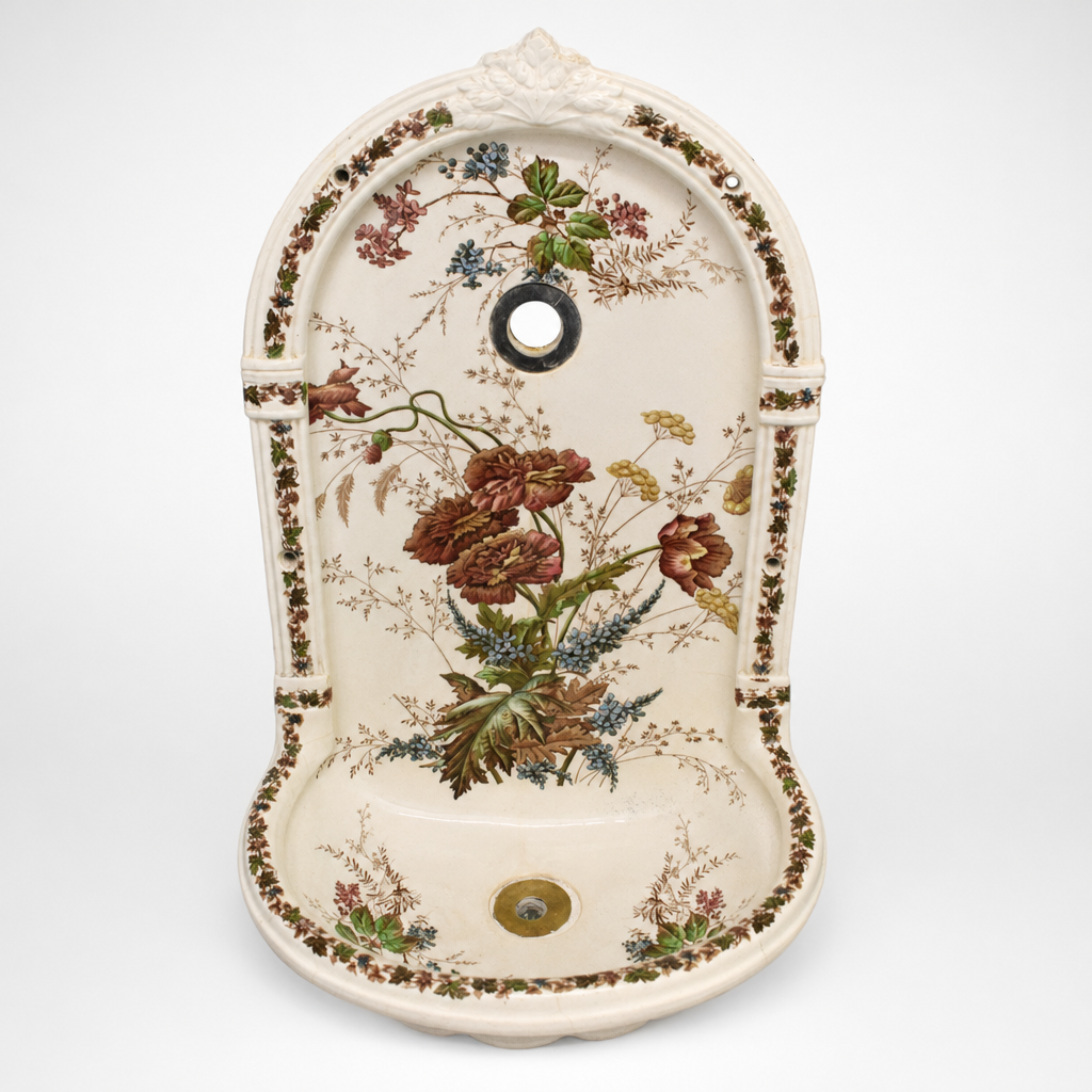 Een uitzonderlijk mooi antiek fonteintje van crèmekleurig keramiek, 55 cm hoog, 34 cm breed en 26 cm diep. De boogvormige achterwand is volledig versierd met een weelderig geschilderd bloemstuk: grote donkerrode pioenrozen, blauwe veldbloemen en rankende bladeren op een roomwit fond. Een fijne bloemenrand omlijst het geheel rondom, en bovenaan sluit een klein bladreliëf het geheel klassiek af.