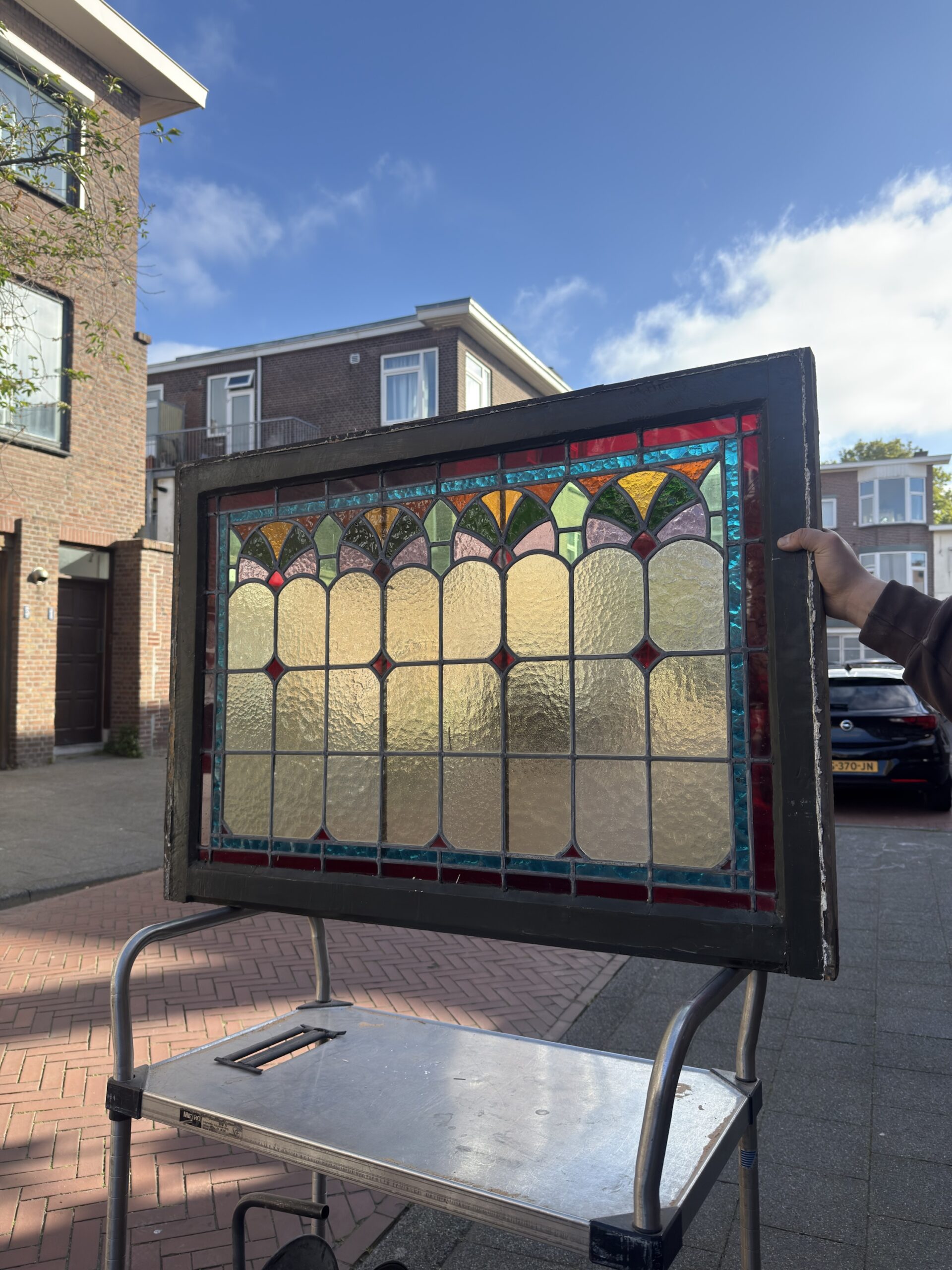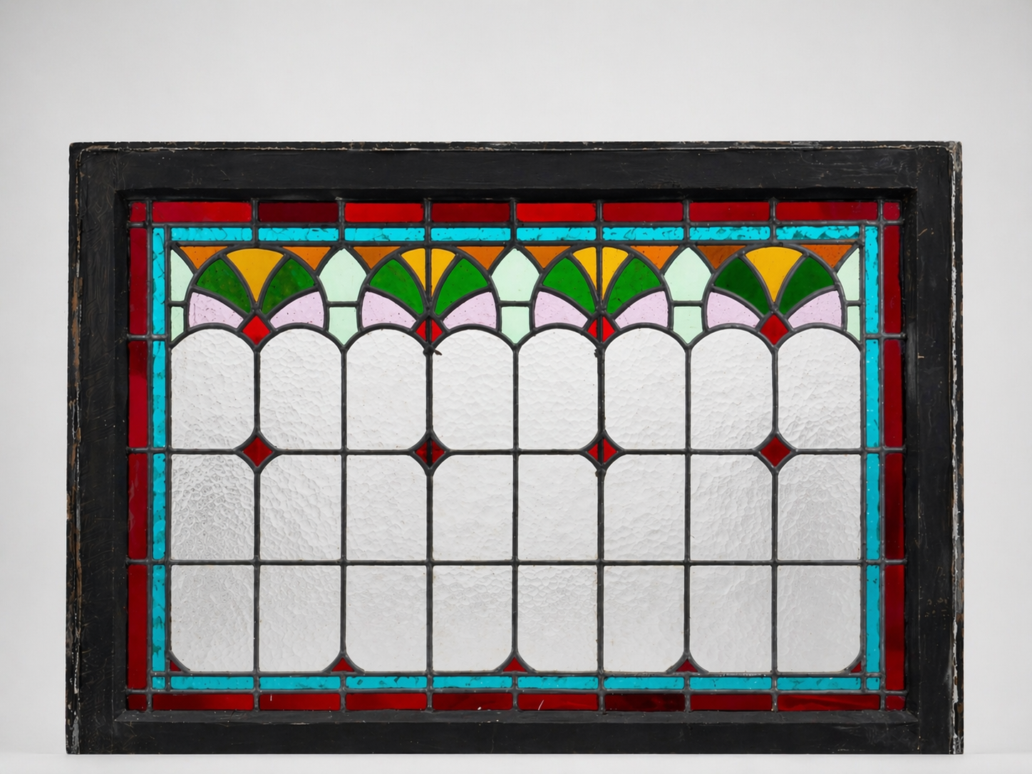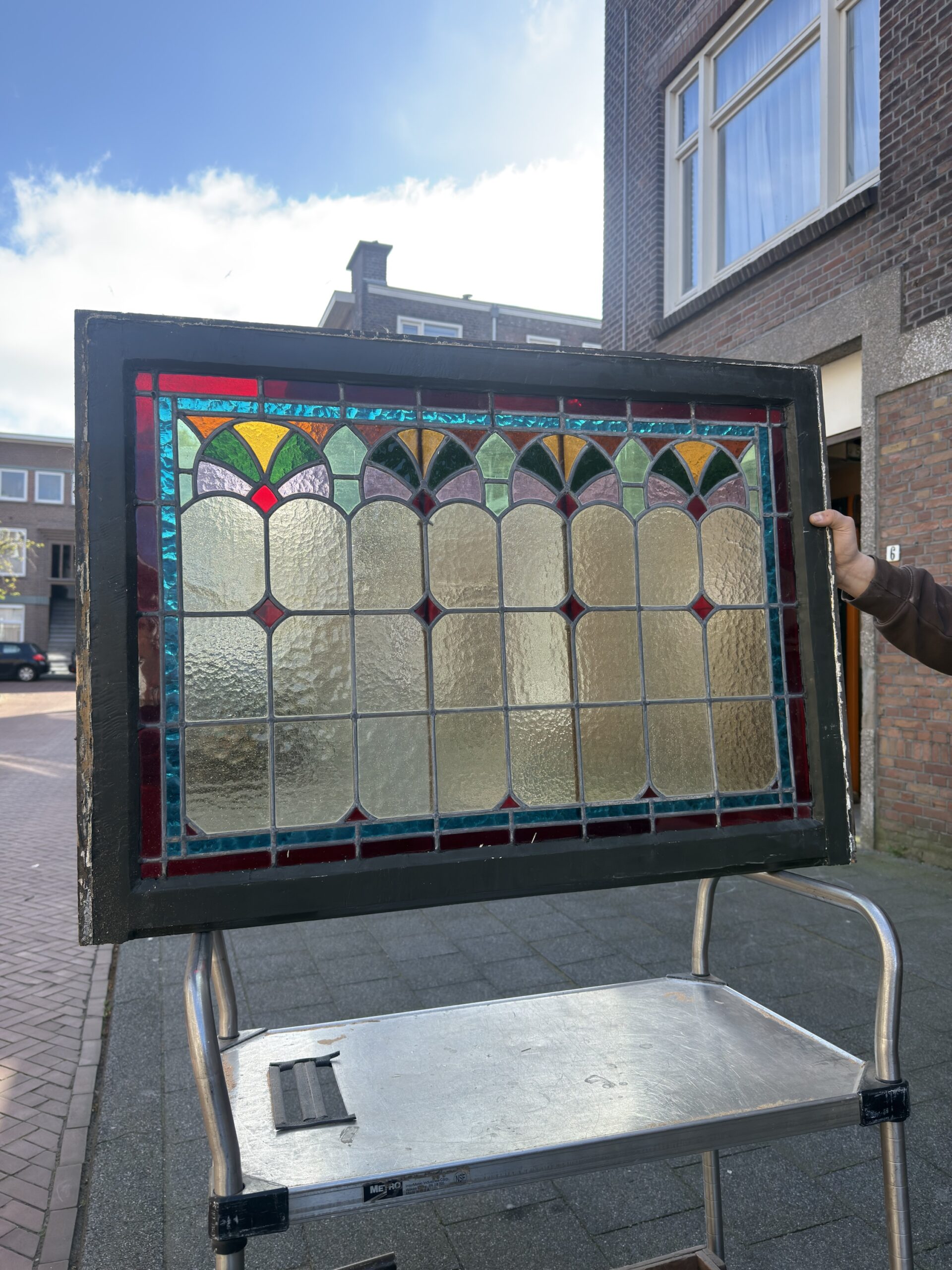 Kleur, ritme en vakmanschap in één raam. Dit glas-in-lood paneel heeft een compositie die direct opvalt: een rij sierlijke boogvormen in structuurglas, bekroond door waaierpatronen in geel, groen en lila, afgewisseld met rode ruitaccenten. Daarboven een brede band in turquoise en rood die het geheel strak omlijst. De zwart gelakte houten omlijsting maakt het paneel compleet en plaatsingsklaar.