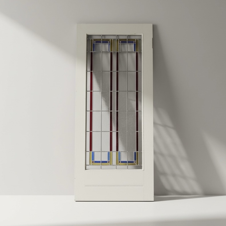 Het glas-in-lood is recent volledig nieuw gezet en kenmerkt zich door het royale gebruik van antiek rood glas, wat zorgt voor een warme en karaktervolle uitstraling. De verfijnde roedes versterken het authentieke, klassieke karakter en geven de deur een stijlvolle, tijdloze look.