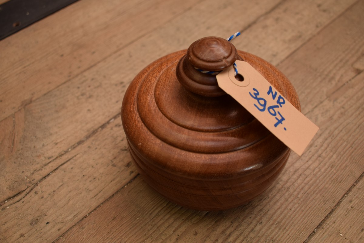 Deze mooie houten pot/bakje is mooi uitgewerkt en bevat een dekseltje.