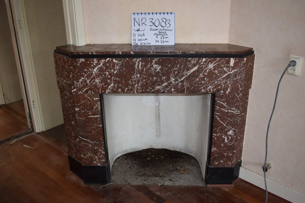 Deze prachtige marmeren hoekschouw is voorzien van rode omloop.