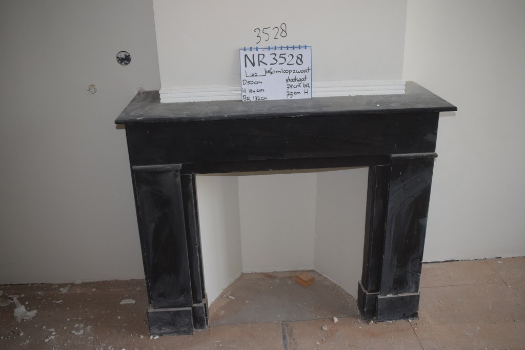 Marmeren schouw met zwarte omloop.