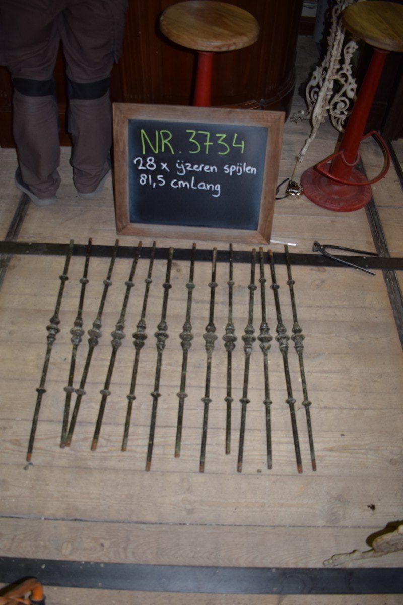 Van deze mooie ijzeren spijlen hebben wij 28 stuks op voorraad. De lengte van de spijlen zijn 81,5 cm
